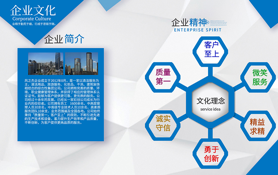公司是一家以清潔服務為主,旅游,干洗、化妝品、裝修和餐飲相結合的多元化發(fā)展運營的服務性企業(yè)。企業(yè)本著誠信第一、服務至上的原則,依靠公司盡我所能、力我所及的信條從2012年到現(xiàn)在服務了多家企業(yè),現(xiàn)在我們已經擁有了400家左右的清潔服務項目和多家洗衣店。我們會一直牢記服務,創(chuàng)新才是我們企業(yè)發(fā)展的服務宗旨。